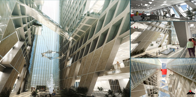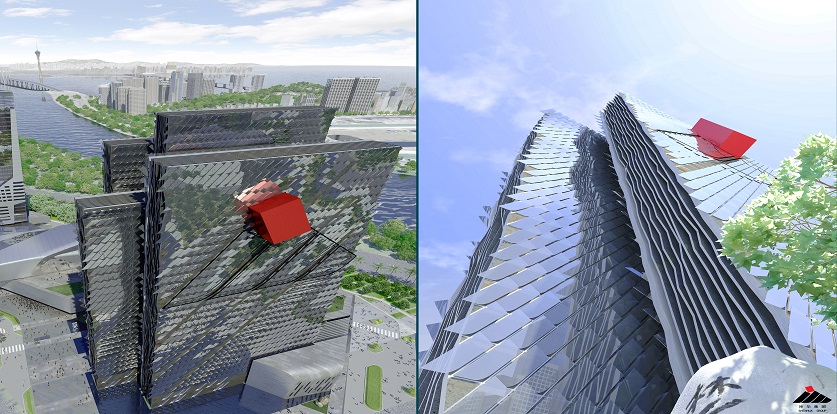 設(shè)計(jì)手法:配合該區(qū)域經(jīng)濟(jì)發(fā)展情況,在短期內(nèi)還需要建設(shè)高質(zhì)量的建筑物。成為城市性標(biāo)志建筑。新總部形象需與自然融為一體,并與周圍的自然元素銜接,且在某種情況下可形成一面“鏡子”,通過(guò)一種特殊形式反射出這些形象:反射出天空的藍(lán),反射出公園的綠、反射出海水的藍(lán)。設(shè)計(jì)了波浪狀的垂直立面,是考慮波動(dòng)的立面可反射出更加逼真的形象。同時(shí)對(duì)總部辦公樓進(jìn)行體量調(diào)整:整體形象為四個(gè)垂直棱柱,分別象征著神華集團(tuán)里四所不同行業(yè)的公司。此設(shè)計(jì)理念主要基于神華集團(tuán)的組織結(jié)構(gòu)分布,外立面上醒目的集團(tuán)標(biāo)識(shí)也再次闡述了建筑的寓意。紅色的棱形柱,橫架于四個(gè)建筑物中,象征著燃燒的煤炭。該設(shè)計(jì)手法加強(qiáng)了對(duì)標(biāo)志概念性的解讀。對(duì)于酒店,設(shè)計(jì)過(guò)程中不引入象征性元素。是基于其本身別具匠心的形象,該形象符合商業(yè)廣告的標(biāo)準(zhǔn),設(shè)計(jì)過(guò)程引入了宏觀穿孔材料,以打造高水準(zhǔn)客房。特殊的宏觀穿孔材料可“適應(yīng)”窗口角度,不斷調(diào)整以指向天空,產(chǎn)生出兩種不同形象的效果,一種是為順應(yīng)商業(yè)的標(biāo)準(zhǔn),而另外一種則體現(xiàn)出其自然屬性。兩座塔樓,一座是總部辦公和及其基礎(chǔ)設(shè)施用房,另外一座是酒店,位于同一群樓的二者功能分布其中,視覺上又形成整體效果,打造出一個(gè)綜合體。會(huì)議中心設(shè)置在群樓上方,該設(shè)計(jì)理念則是源于一種自然設(shè)計(jì)的手法。總部的塔樓和酒店均為南北朝向,并合理地運(yùn)用錯(cuò)層式設(shè)計(jì),使其坐看珠江和澳門海灣美景。